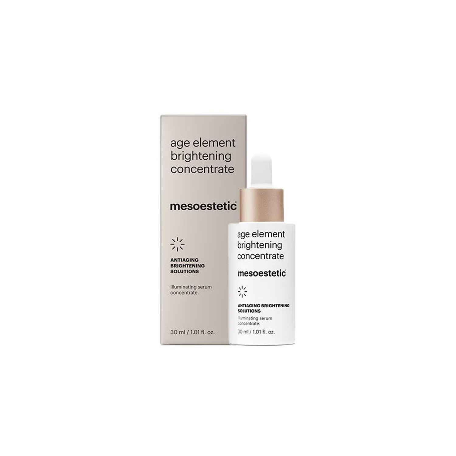 Age Element Brightening Concentrate de Mesoestetic es un serum concentrado iluminador de alta potencia diseñado para mejorar la luminosidad, unificar el tono y reducir las manchas faciales. Su fórmula combina vitamina C estabilizada, niacinamida y potentes antioxidantes que protegen la piel frente al daño oxidativo, previenen el envejecimiento prematuro y reactivan el resplandor natural del rostro.