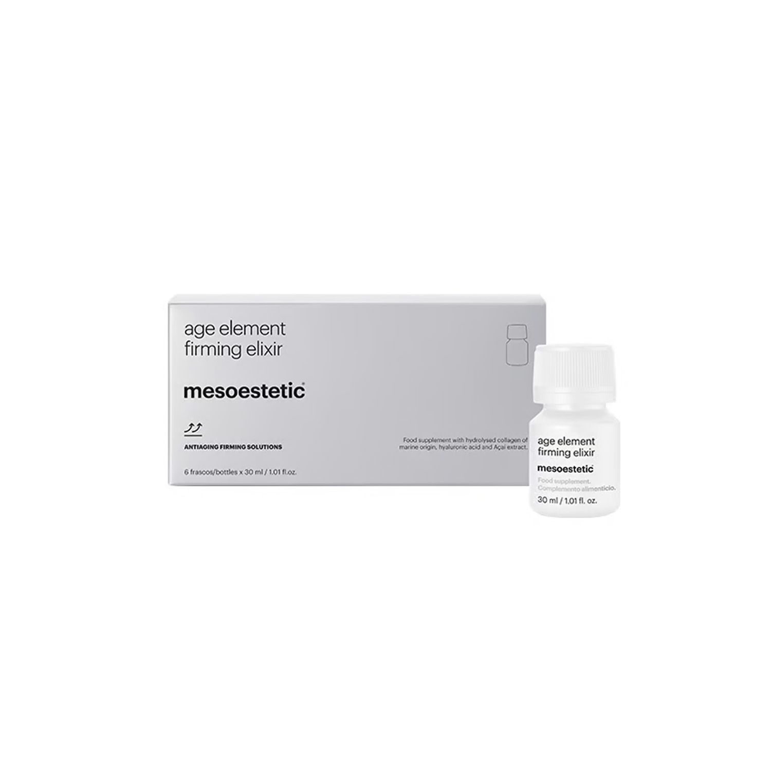 Age Element Firming Elixir de Mesoestetic es un complemento nutricosmético bebible diseñado para reafirmar la piel desde el interior y mejorar la elasticidad cutánea. Su fórmula avanzada combina colágeno hidrolizado de alta pureza, ácido hialurónico, vitaminas antioxidantes y minerales esenciales que estimulan la síntesis de colágeno y combaten el envejecimiento cutáneo.